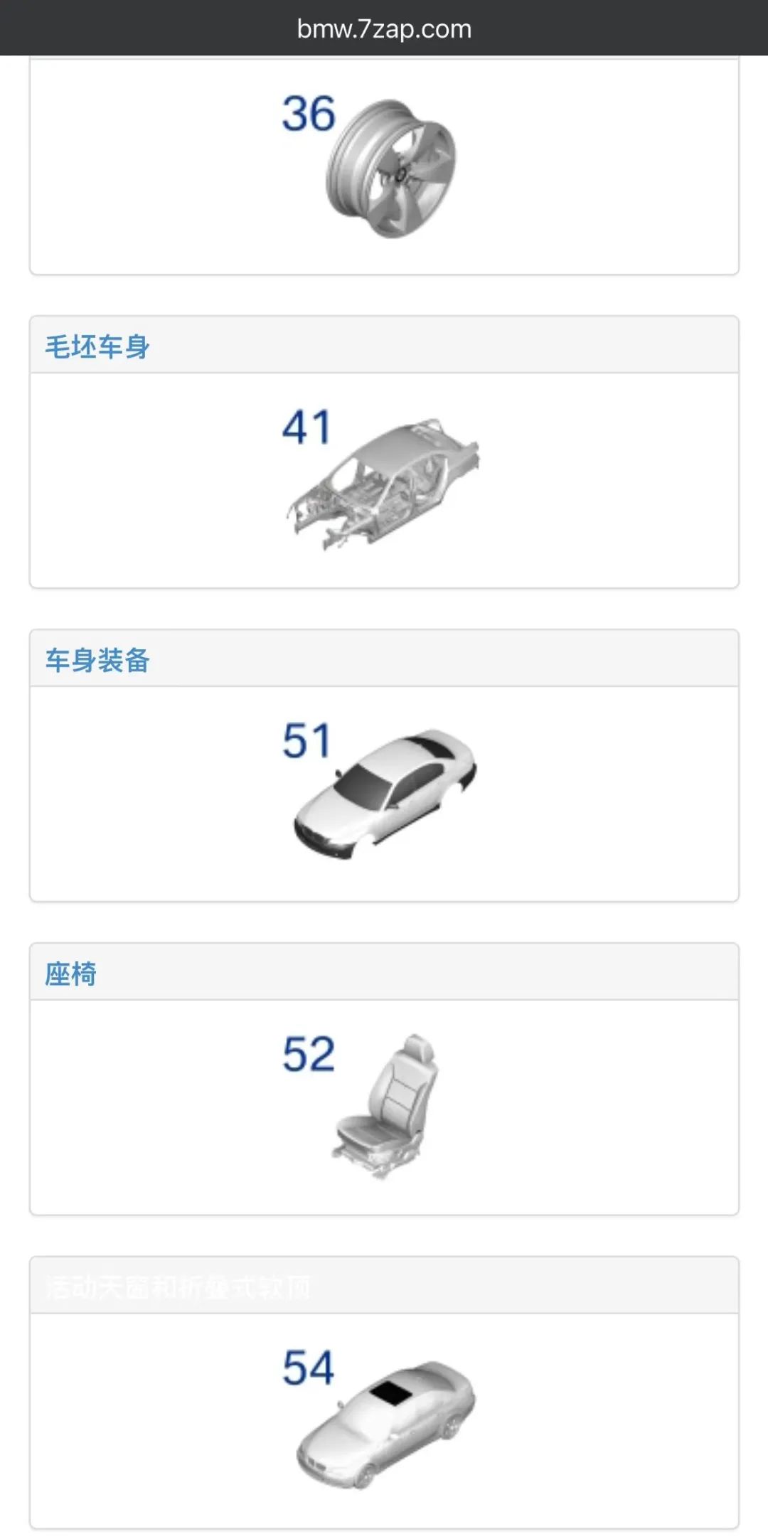 那么如果有的配件上面你找不到零件號怎么辦,這里就要提到寶馬的ETK系統了。通過ETK系統,無論是配件商或者個人,都可以在上面找到零件,而且圖文并茂,你可以通過損壞的位置的圖例索引到你要找的零件和零件號,再通過這個給配件商報去。如圖所示,你可以根據大致位置先定位分類,比如開頭為41的零件就是bodywork相關的,51就是trim相關的零件。