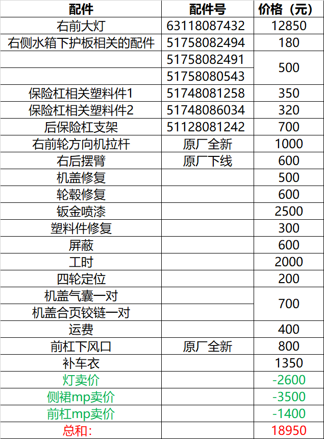 以上便是我的修車歷程。最終花費25000元+,其中最高的費用就是原廠的全新大燈13000元。除去賣掉的改裝包圍和壞的大燈,最后凈花費19000元。這還是在沒有使用任何拆車件的情況下,其實對于一臺進口的M來說,已經是很小的成本了,當然,這里也要感謝配件商和改裝店,給到了非常合理的價格。