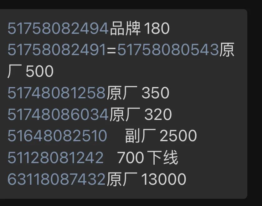 找到零件后,可以把所有所需零件合成一個表格,發給配件商讓他報價。這里就有另一個學問,報價的零件可能有好幾種價格,包括全新原廠訂貨,全新原廠現貨,全新原廠下線件,全新副廠品牌件,拆車原廠件。同樣的東西價格有所不同,以G87 M2為例,由于這個車子非常新,幾乎沒有拆車件,所以只能訂新件,但是有一些部位塑料件的原廠價格非常高,這時候可以選用一些品牌副廠件,他們仍是原廠開模,合裝孔位,但是價格會低一半甚至更多。