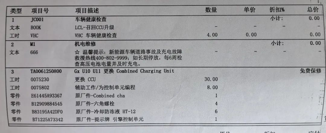 由于車輛除了前面提到的假性“無法充電”,并未出現過其他充電問題,但出于謹慎,遂預約了時間。到店后了解到2023款車型所配置的CCU存在隱患,技術升級實則是根據不同車輛批次對CCU進行重新編程或更換,本人車輛批次要進行CCU的更換。更換完成又進行了車輛全面檢查,車輛一切正常,總用時5h左右。