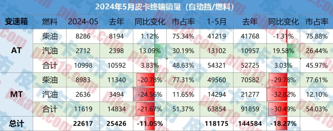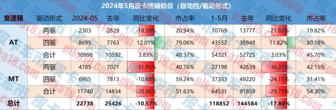 今年5月,國(guó)內(nèi)皮卡市場(chǎng)終端狹義銷量為23,739輛,其中自動(dòng)擋皮卡銷量為10,998輛,手動(dòng)擋為11,740輛,相比上個(gè)月手動(dòng)擋皮卡多賣了近2000臺(tái)銷量,本月自動(dòng)擋皮卡與手動(dòng)擋的差距進(jìn)一步縮小。