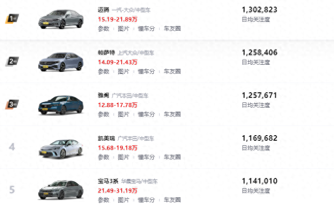 實際上,如果你打開中型車熱門榜,就會發(fā)現(xiàn)目前最受消費者關注的中型車,就包含了帕薩特。而在我們城市,本日熱度第一的中型車是一汽-大眾邁騰,而上汽大眾帕薩特,則位于細分市場熱度榜第二名,日均關注度達到1258406。眾所周知,一輛車越受消費者關注,它的銷量就會越高,帕薩特受到這么多消費者的關注,其銷量成績出色,自然合情合理。
