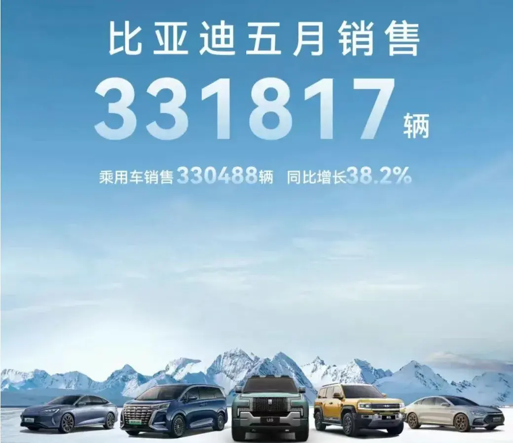 傳統(tǒng)新能源車企中,剛發(fā)布DM 5.0與兩款新車的比亞迪5月份銷量再次開大,僅乘用車銷量就達到了330488輛,同比增長38.2%,今年1-5月的累計銷量已達1266934輛。多數(shù)人認為,以比亞迪當前的勢頭,破400萬的年銷量不成問題。