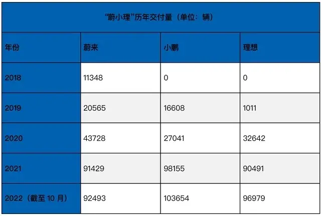 2018年12月,小鵬汽車首款車型G3正式交付,相比首先入市的蔚來汽車晚了半年左右,但小鵬汽車用4年時間追上了這半年左右的差距。2022年11月 1日,小鵬汽車宣布1-10月累計銷量達103654輛,成為造車新勢力中首個年銷量破十萬輛的車企。