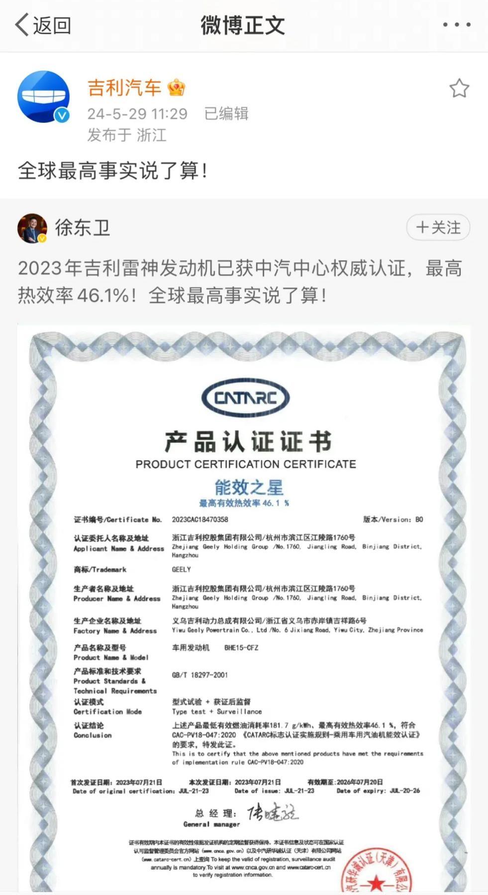 吉利汽車高管徐衛東在29日中午,發布了一條關于吉利雷神發動機已經在2023年拿下46.1%最高熱效率認證,并且喊出了“全球最高事實說了算”的口號,而且還號召媒體和KOL轉發,我的朋友圈可熱鬧了……