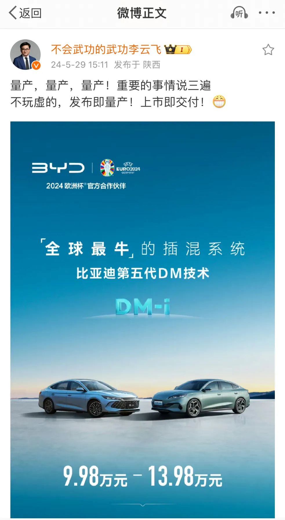 比亞迪品牌及公關處總經理李云飛,也迅速開始講事實,擺依據!29日下午3點多,李云飛在社交平臺發布消息,強調了量產、量產、量產!言下之意就是說,咱別拿實驗室的數據說話哈,第五代DM技術下46.05%的發動機熱效率,就是當下量產車型中最高的。