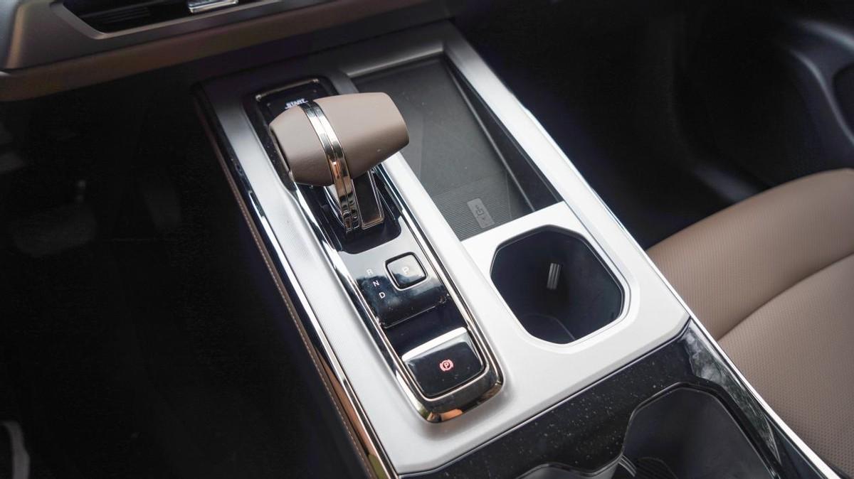 屏幕下方是換擋區(qū)域,在電子換擋桿周邊還設有多個儲物格,比較可惜的是該車并沒有提供無線充電功能,不過廠家還很貼心地在面板后方也留有充電線的預留口。