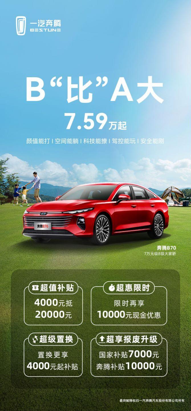 根據優惠信息可知,奔騰B70即日起將享受以下四大優惠,分別是:4000元抵20000元的超值補貼、10000元的限時現金優惠、4000元起的超級置換以及共計17000元的超享報廢升級。在四重大禮的接連猛攻下,奔騰B70的起售價就來到了7.59萬元。用A級車的價格就能買到B級車,想想都幸福!