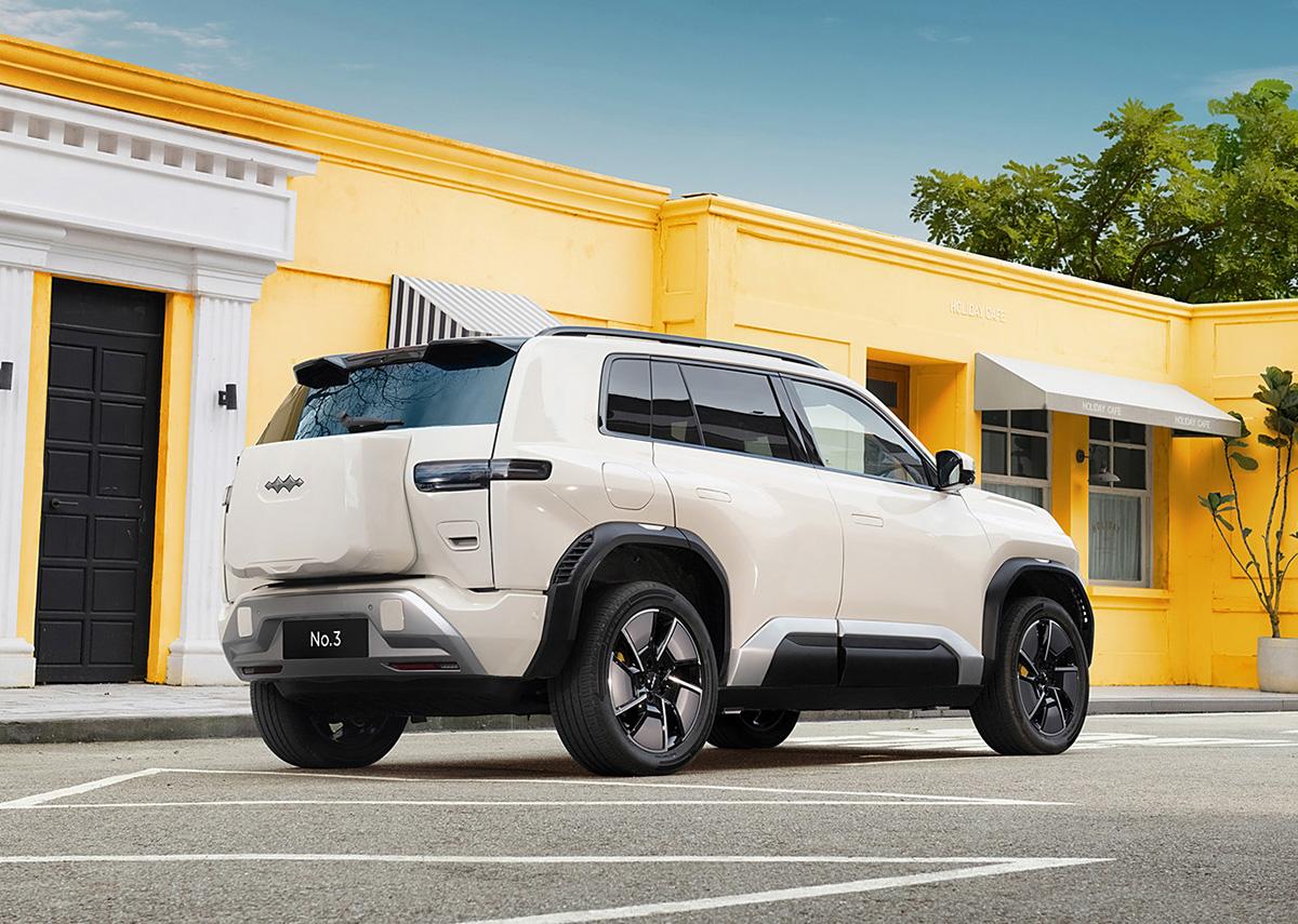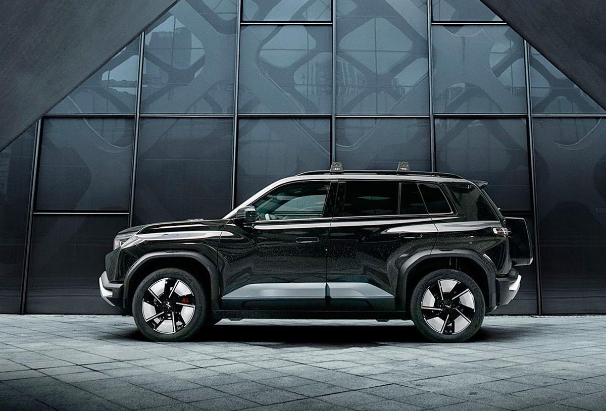車身側面造型很硬朗,使用了很有肌肉感的線條和塊面設計,前后翼子板向外隆起,翼子板和輪眉銜接位置是內凹結構,在前輪眉的前部還帶有進氣孔,后輪眉的后側則是帶有散熱孔的造型。車身下護板是很有立體感的隆起造型,車門把手為彈出式結構。