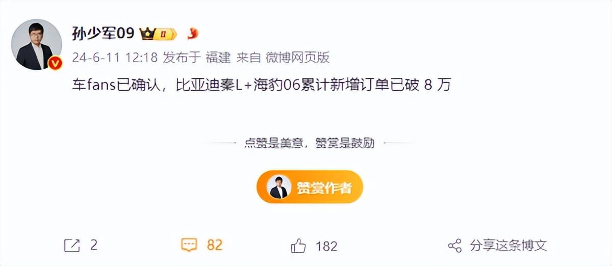 6月11日,“車fans”創(chuàng)始人孫少軍扔出一則重磅消息,比亞迪最新車型秦L+海豹06累計訂單已超過8萬臺。之前網(wǎng)傳聞秦L銷量火爆,這次得到了側面印證,但此消息并未得到比亞迪官方的證實。