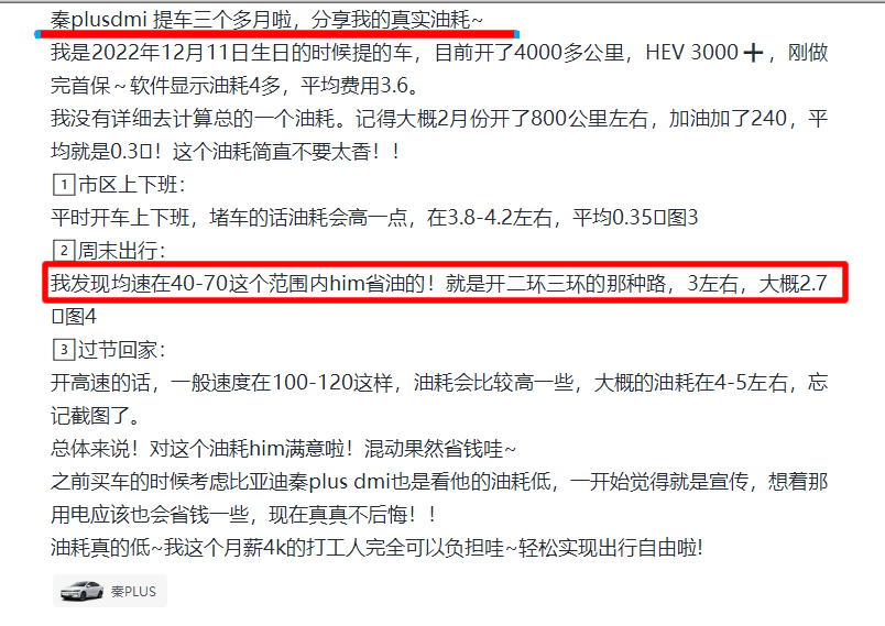 作為對比,某汽車論壇上,秦PLUS車主的真實駕駛情況顯示,油耗也可以開到2.7L,不過是在勻速40-70km車速情況下得出的。由此可見,要想達到超預期的低油耗,行車環境很重要,溫度適宜,空調制冷且開的不太極端,城區不怎么擁堵的線路,平坦或者下坡路段,且承載重量不大(乘客不多),只要做到這些條件,油耗自然不會高。