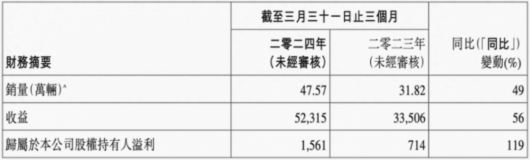 此外,吉利汽車也披露了附屬公司極氪的財務表現概要。財報顯示,極氪第一季度交付3.3萬輛,同比增長117%;實現營收147億元,同比增長71%;毛利為18億元,同比增長137%;毛利率達12.3%,較2023年的8.9%上漲3.4個百分點。