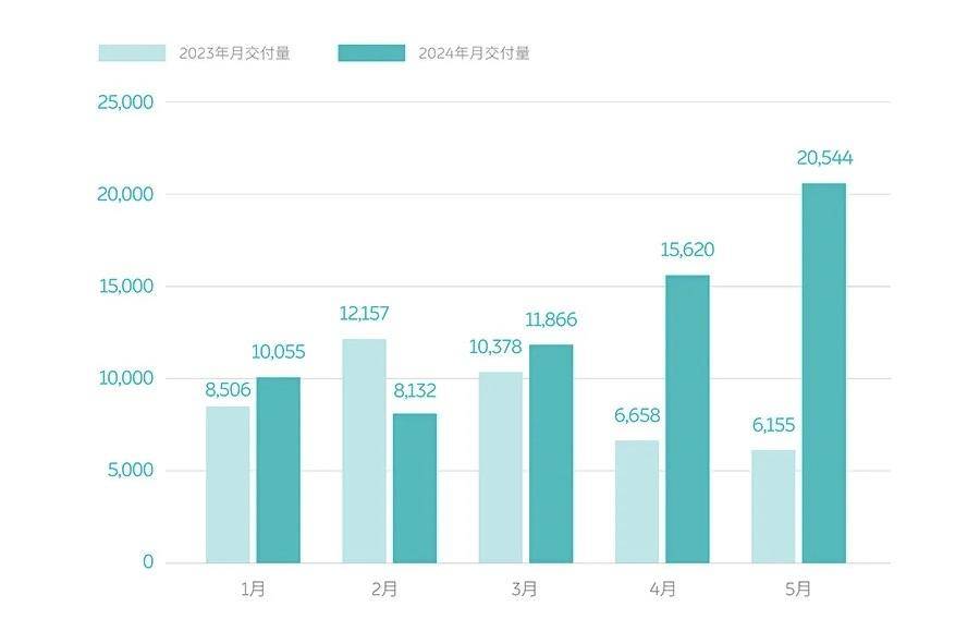 蔚來銷量創新高,5月份共交付20544輛新車,同比增長233.8%,環比增長31.5%。