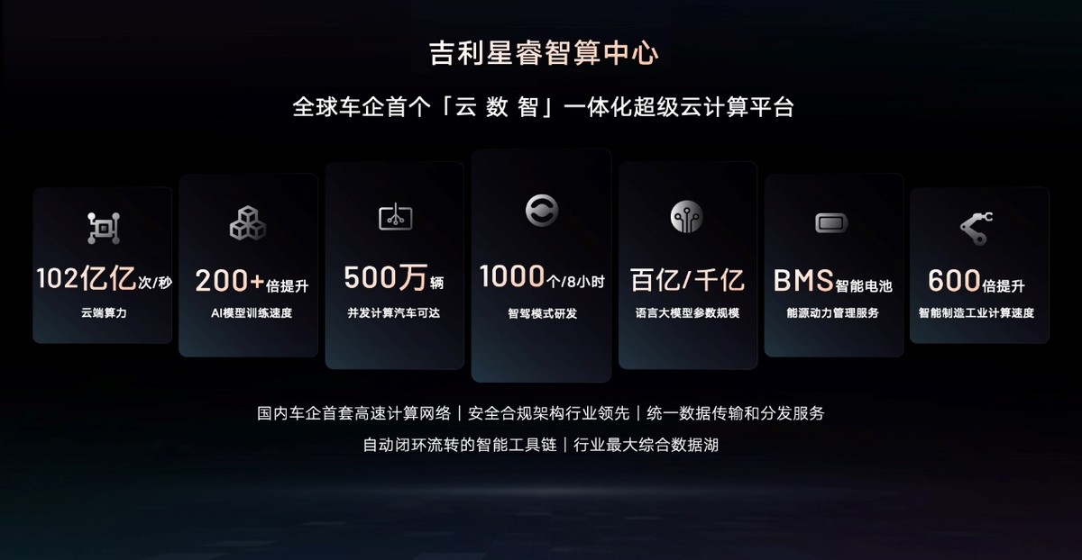 智能化功能的實(shí)現(xiàn),離不開(kāi)吉利星睿智算中心的強(qiáng)大算力底座。星睿智算中心是全球車(chē)企首個(gè)“云-數(shù)-智”一體化超級(jí)云計(jì)算平臺(tái),目前可滿(mǎn)足500萬(wàn)在線(xiàn)車(chē)輛并發(fā)計(jì)算需求。星睿AI大模型,正是吉利依托強(qiáng)大算力打造的全球首個(gè)汽車(chē)行業(yè)全棧自研全場(chǎng)景AI大模型,已獲中國(guó)通信院“4+級(jí)”最高等級(jí)評(píng)級(jí)。基于星睿AI大模型與豐富內(nèi)容生態(tài)開(kāi)發(fā)而來(lái)的AI銀河精靈,從車(chē)端、移動(dòng)端全鏈路解決用戶(hù)用車(chē)問(wèn)題,成為“全場(chǎng)景AI超級(jí)伙伴”。