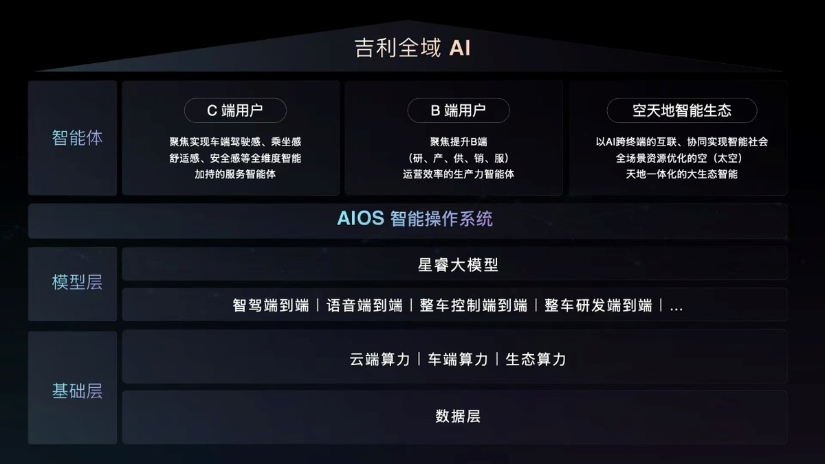 2025年將是吉利的產(chǎn)品大年,吉利銀河計(jì)劃推出2款SUV和3款轎車(chē),全面進(jìn)入主流新能源市場(chǎng),完善產(chǎn)品矩陣。打造產(chǎn)品競(jìng)爭(zhēng)力,卓越技術(shù)依然是重點(diǎn)。2025年國(guó)際消費(fèi)電子展(CES)期間,吉利發(fā)布行業(yè)首個(gè)“智能汽車(chē)全域AI”技術(shù)體系,致力于打造有溫度、有情感、可持續(xù)成長(zhǎng)的原生“出行智慧生命體”。今年,吉利將在產(chǎn)品上普及應(yīng)用端到端語(yǔ)音大模型、AI數(shù)字底盤(pán)、高階智能駕駛等最新AI技術(shù)成果,讓智能汽車(chē)AI科技實(shí)現(xiàn)技術(shù)普惠。