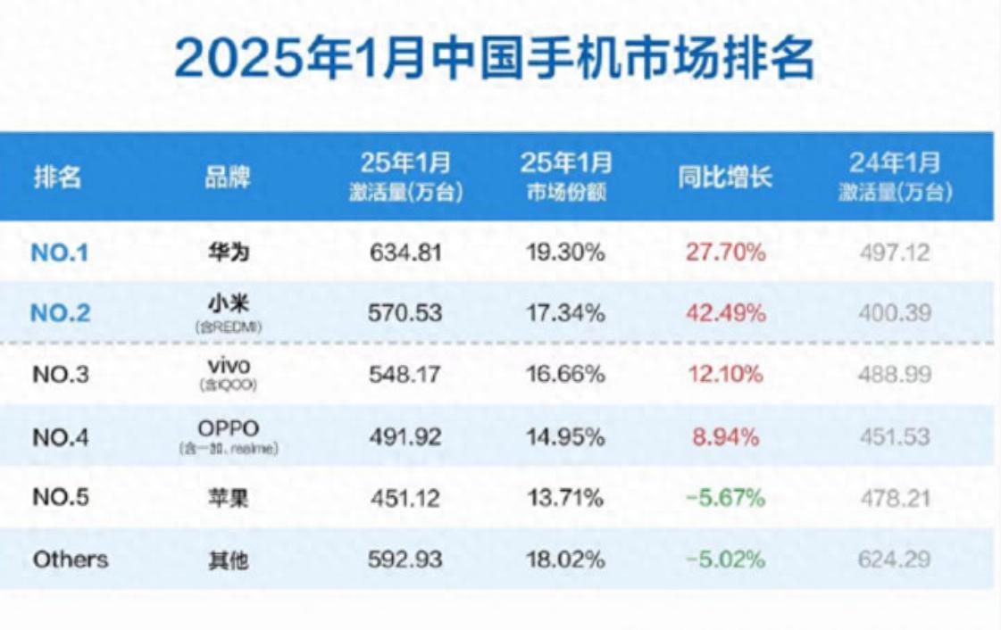 2025年1月,華為直接獲得第一,這個還是激活量第一,比較直觀反映銷量激活量情況,1月20日國補開始,又有春節(jié)前黃金周,華為這個月份獲得634.81萬激活量,占據(jù)19.3%,同比大漲27.70%,第二名是小米,第三名是vivo,第四名是PPPO,四大廠家同比都上漲,第五蘋果,同比下滑了。