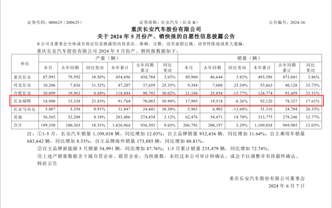 相比之下,福特在中國市場的銷量規模,則相對沒有那么優秀了。官方數據顯示,2024年5月份,長安福特的單月銷量為17905臺。