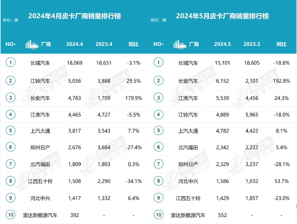 乘聯會數據顯示,2024年5月份皮卡銷量前10名廠商中,長安汽車、江淮汽車、上汽大通、北汽福田、河北中型等上榜車企銷量同比上漲。