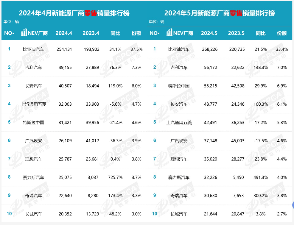 乘聯會數據顯示,2024年5月份新能源汽車零售銷量前10名廠商中,高達9家車企的銷量同比上漲。