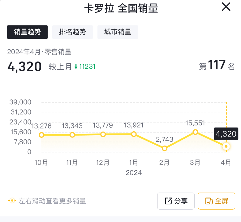 行業綜合銷量數據顯示,2024年4月,一汽豐田卡羅拉的單月零售銷量為4320臺。