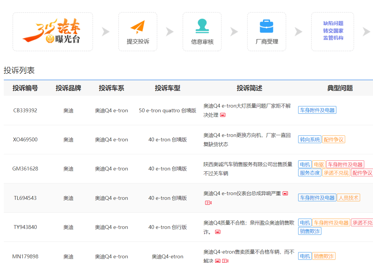 不僅如此,值得注意的是,目前國內第三方汽車網站顯示,奧迪Q4-e-tron存在一些質量和售后方面的投訴。