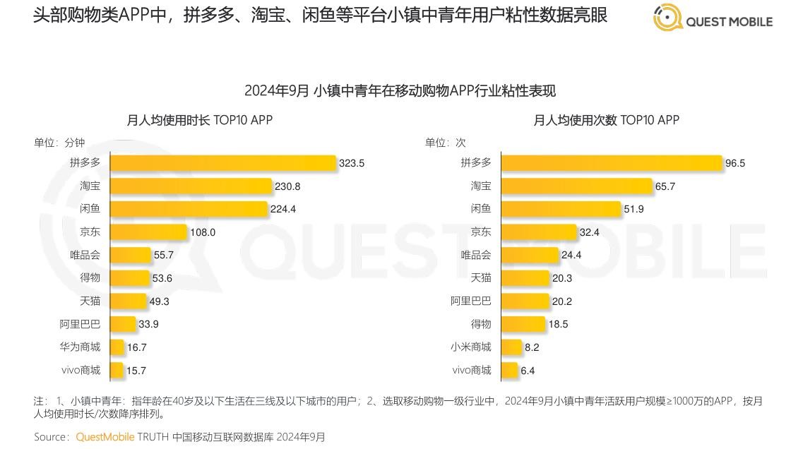 根據(jù)國家統(tǒng)計(jì)局?jǐn)?shù)據(jù),2024年,我國城鎮(zhèn)居民人均可支配收入同比增長4.7%,農(nóng)村居民人均消費(fèi)支出同比增長6.1%,城鄉(xiāng)居民收入差距持續(xù)縮小??h域市場不僅釋放出更大消費(fèi)活力,也表現(xiàn)出更強(qiáng)的消費(fèi)意愿。Quest Mobile發(fā)布的《2024年小鎮(zhèn)中青年消費(fèi)洞察報(bào)告》指出,小鎮(zhèn)中青年因?yàn)楣ぷ飨鄬p松、通勤時間短,有更多閑暇時間關(guān)注生活品質(zhì)提升。近75%的被調(diào)查者愿意為高品質(zhì)商品多付費(fèi),拼多多成為小鎮(zhèn)中青年月均使用時長和使用次數(shù)最多的頭部線上購物平臺。
