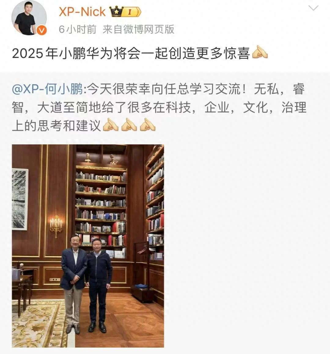 2月12日,何小鵬在微博上曬出與任正非的合影,并寫道:“今天很榮幸向任總學習交流!無私,睿智,大道至簡地給了很多在科技、企業、文化、治理上的思考和建議。”