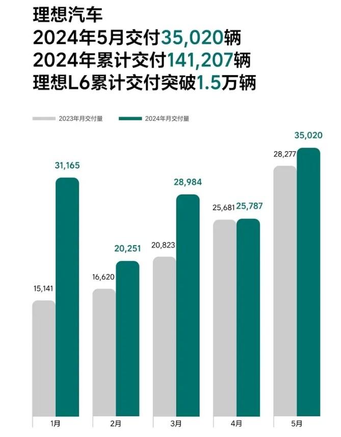 先來看理想在5月份的交付量數據表現。5月份。理想汽車共交付新車35020輛,并且同比增長23.8%。其中,理想L6自4月24日交付以來,已累計交付超過1.5萬輛,而理想L7/8/9車系的銷售勢頭則是在穩步地有所提升。