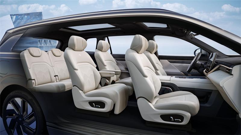 eπ008前排座椅標配電動調節和通風加熱,主駕配有位置記憶和電動腰托。第二排為公務艙式的大兩座設計,均支持電動調節及通風加熱,右側可選裝零重力座椅,支持一鍵躺平,帶8點按摩,還配有遮陽簾和小桌板。二排中間通道寬180mm,進出也很方便。第三排的空間也很可觀,靠背到前排椅背距離700毫米,可媲美B級車第二排乘坐舒適度,還配有獨立杯架、閱讀燈、充電口。