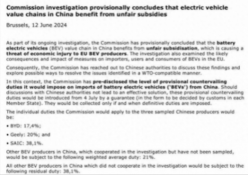 6月12日,歐盟委員會發(fā)表聲明,擬從7月4日起對從中國進口的電動汽車征收臨時反補貼稅。這一消息旋即在汽車界產生了巨大的轟動。