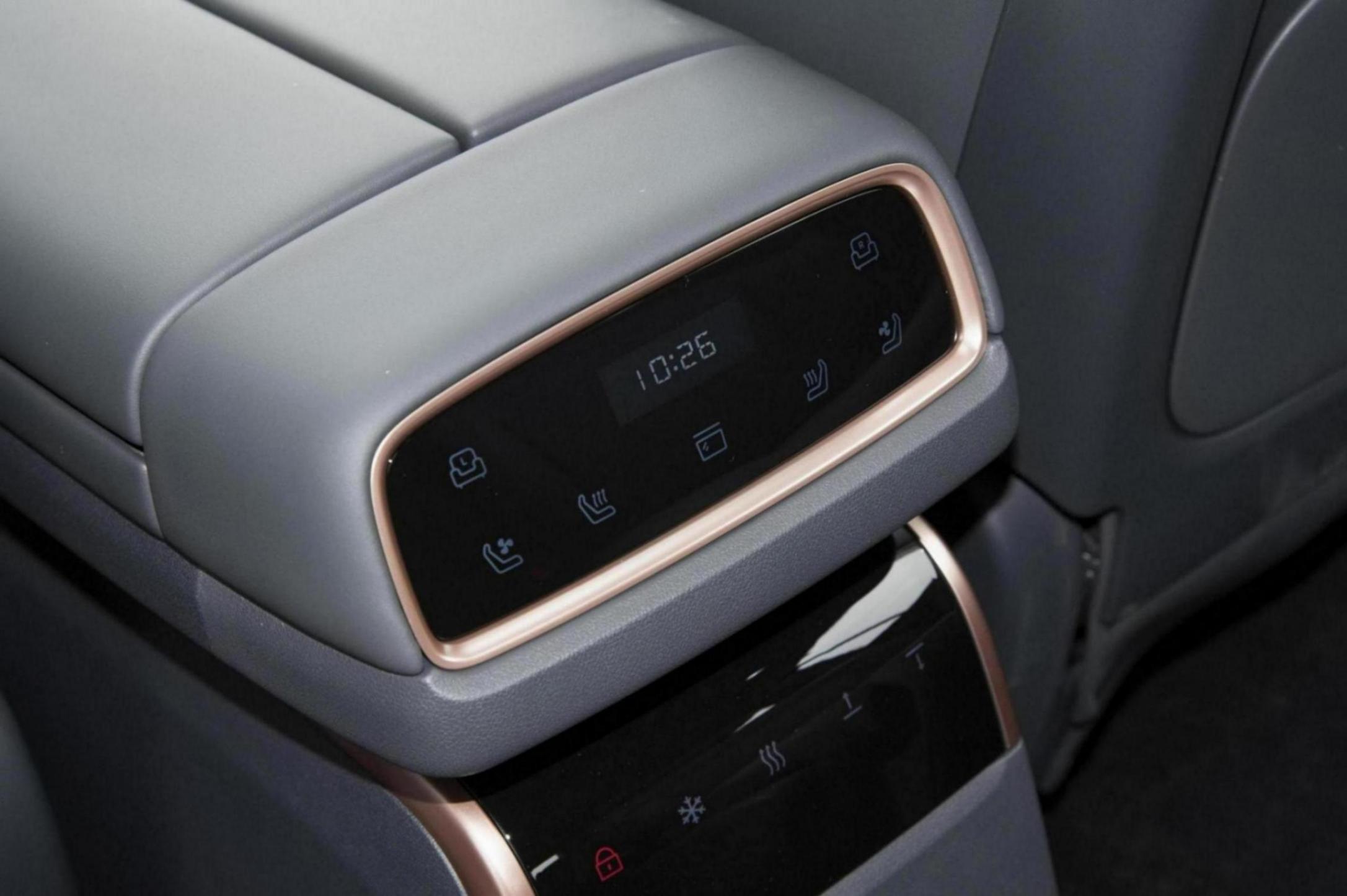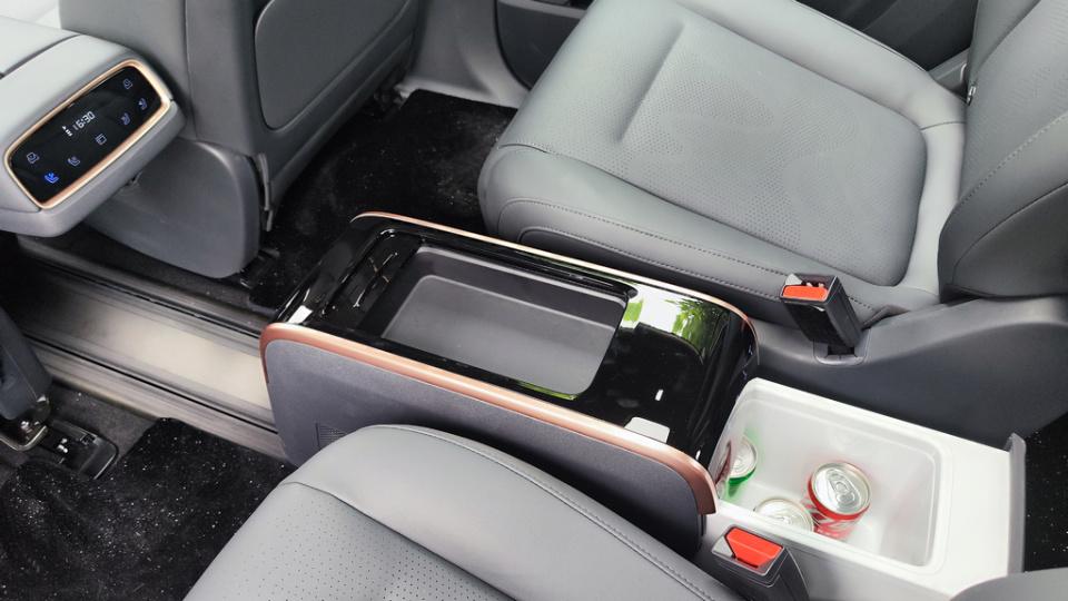 二排的上下雙觸摸屏也很有意思,上邊可以調節座椅通風加熱及后排小憩模式,下邊觸屏可以調節冰箱,支持5℃-50℃溫度調節,也可以化身導臺從一排滑動到三排。