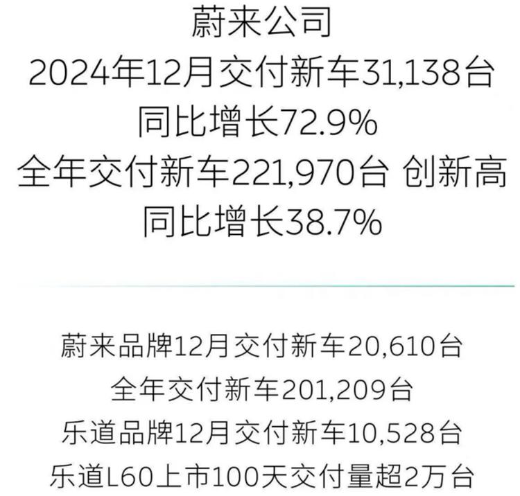 而這種高壓的氛圍,反映出的則是蔚來汽車在經(jīng)營上遇到的困境。在“蔚小理”中的理想已實(shí)現(xiàn)盈利、小鵬銷量也實(shí)現(xiàn)騰飛的情況下,蔚來的銷量大多數(shù)時(shí)候卻徘徊在2萬輛出頭,而去年12月其銷量之所以罕見地突破了3萬輛,主要還是因?yàn)闃返赖慕桓妒状纹迫f。遺憾的是,除了12月,樂道自9月上市后的月銷量始終只有幾千輛上下,而這很難稱得上擔(dān)起了“走量”這一重任。
