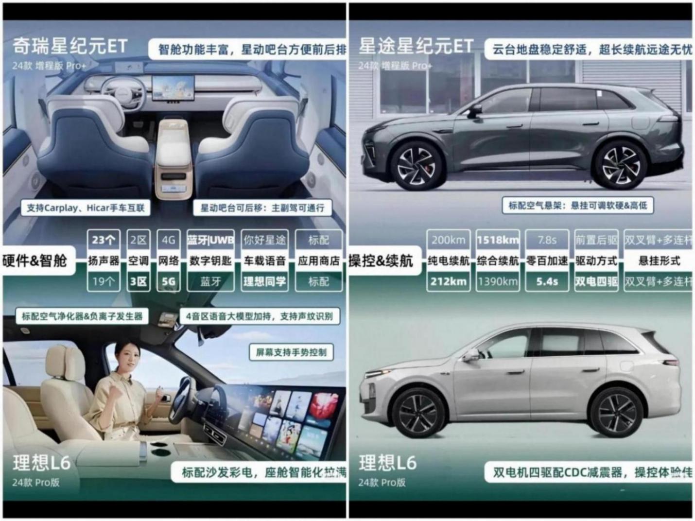 理想L6網(wǎng)上口碑有爭議,但銷量卻一路飄紅,讓不少車企眼紅。奇瑞推出的星紀(jì)元ET,就想和它掰掰手腕。咱今天就來對比一下這兩款車的熱門車型——理想L6 Pro版和星紀(jì)元ET四驅(qū)Max版。