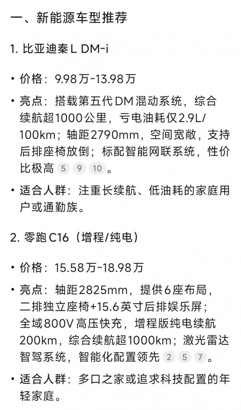 首先,新能源汽車方面Deepseek首先推薦的為比亞迪秦L DM-i,這款車主打一個性價比,并且推薦給注重長續航、低油耗的家庭或者上班族。
