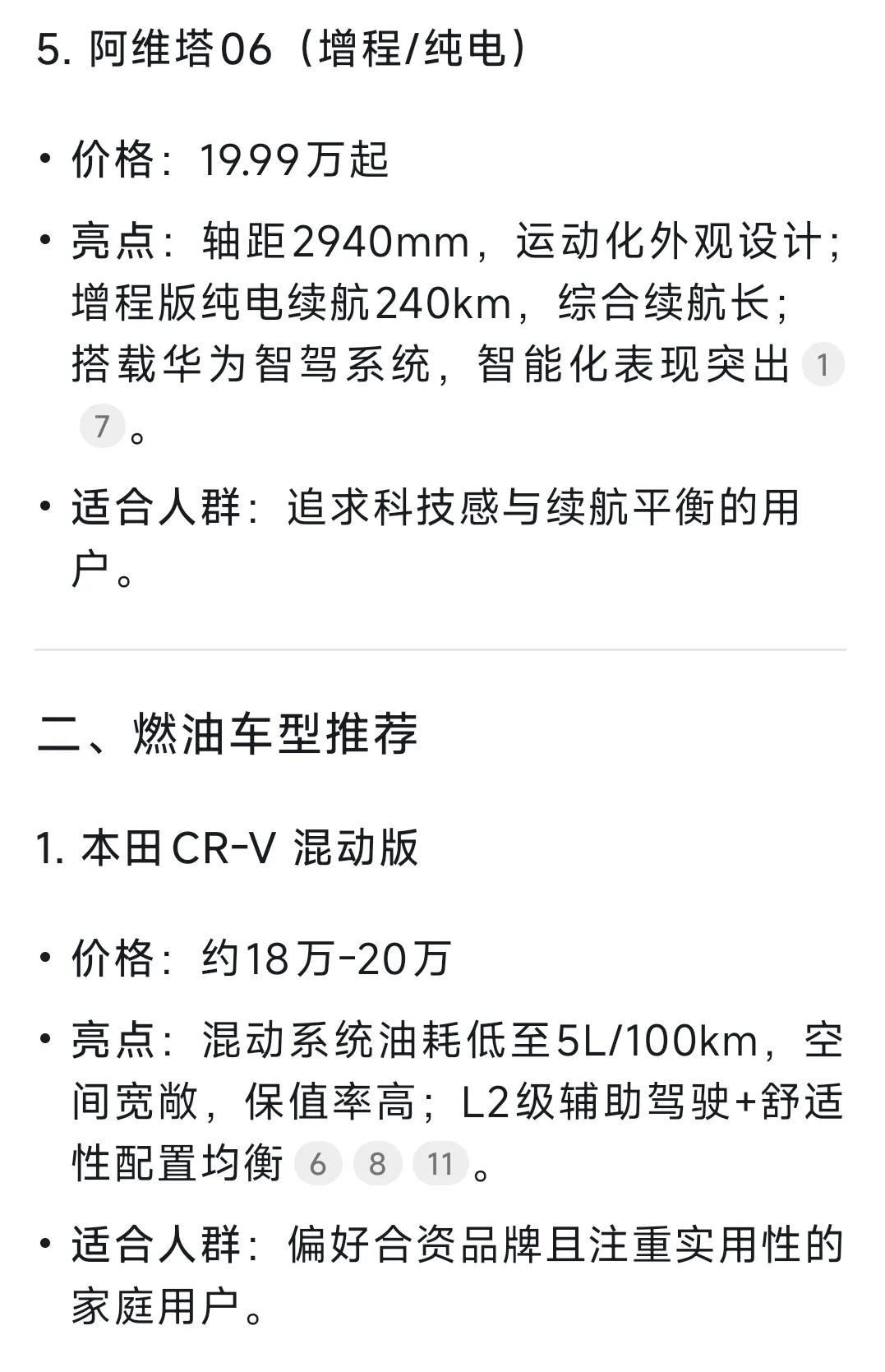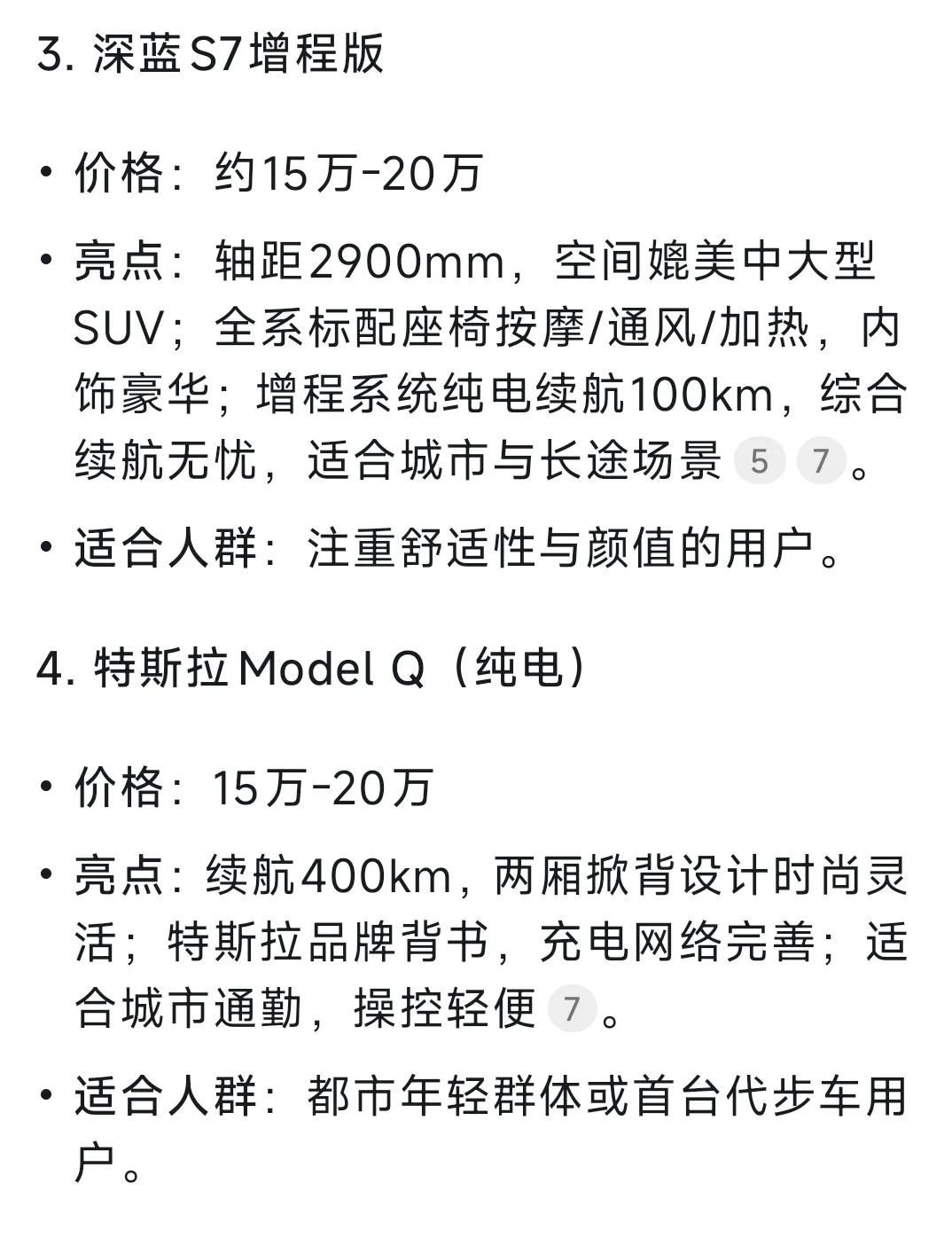 另外Deepseek還給不同用戶群體推薦了其他增程和純電汽車,就包括:零跑C16、深藍S7、阿維塔06以及純電版本的特斯拉Model Q,主打一個多元化推薦。