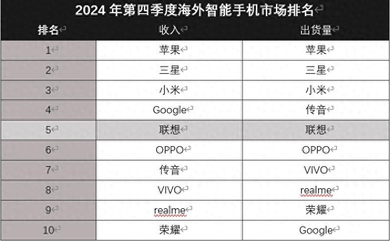 這不在2月14日網上流出一份海外市場2024年第四季度的數據,據說該數據是來自IDC。大家要注意這個數據是純海外市場的排名,也就是除了我們國內市場之外所有市場的排名。根據流出的數據顯示海外市場出貨量排名第一的是蘋果,排名第二的是三星,排名第三的是小米,排名第四的是傳音,排名第五的是聯想。OPPO、vivo、realme、榮耀、谷歌分列六到十位,如果按收入算蘋果還是排名第一的,三星還排名第二,小米還是排名第三,但第四變成了谷歌,第五還是聯想。排名六到十位的分別是:OPPO、傳音、vivo、realme、榮耀。