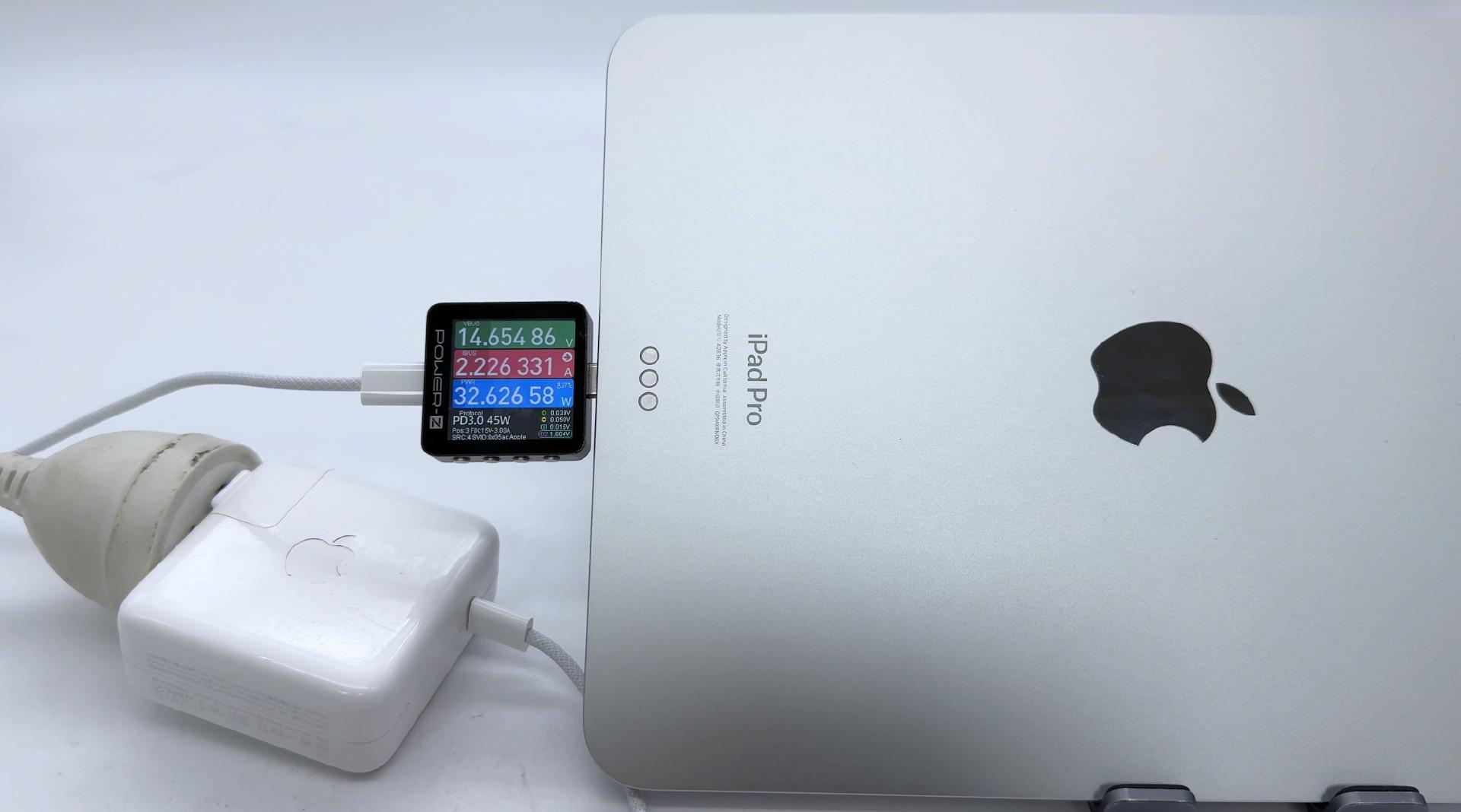 使用原廠的蘋果70W充電器為平板充電,實測當前平板輸入端功率約為14.65V 2.23A 32.63W。