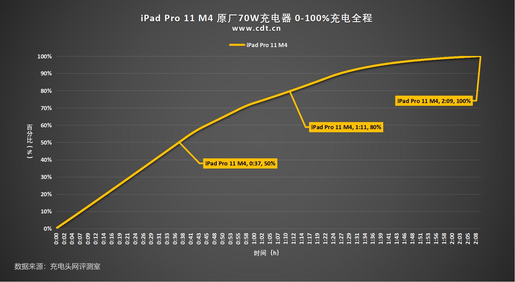 繪制出折線圖,可以清楚看出使用原廠70W充電器為iPad Pro 11 M4充電,37分鐘充至50%;1小時11分鐘充至80%;從0%開始至完全充滿耗時約2小時9分鐘
