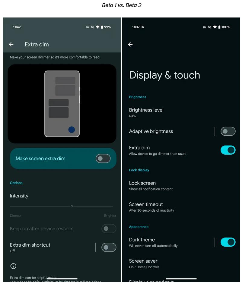 在“顯示和觸控”設(shè)置中移除了“Extra dim”自定義選項(xiàng)。