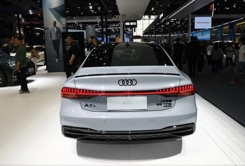 車尾部分,2024款奧迪A7L采用了簡潔大氣的設計風格,貫穿式的尾燈是車尾的一處視覺焦點,尾燈內部采用了LED光源,點亮后可以呈現出一種獨特的光帶效果,在夜晚具有較高的辨識度。下方雙邊共兩出的排氣布局,不僅彰顯了車輛的運動性能,還為車尾增添了一份力量感。此外,車尾的線條的設計比較簡潔流暢,層次感分明,與整車的設計風格相得益彰。