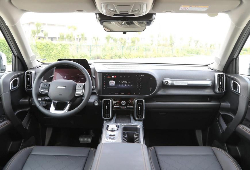 前臉復(fù)古圓形大燈搭配粗壯橫幅式進(jìn)氣格柵,視覺(jué)沖擊力十足,還透著一股復(fù)古韻味。車(chē)身側(cè)面的獨(dú)特標(biāo)識(shí)與實(shí)用的車(chē)頂行李架,不僅凸顯越野屬性,更為熱衷戶(hù)外出行的消費(fèi)者提供便利。車(chē)尾寬大厚實(shí),貫穿式尾燈從兩側(cè)向下延伸,有著較高的辨識(shí)度,底部隱藏式雙邊單出排氣布局,讓整車(chē)精致感倍增。然而,方正的車(chē)身導(dǎo)致風(fēng)阻系數(shù)偏高,高速行駛時(shí)油耗增加,風(fēng)噪較大,車(chē)速超一定速度時(shí),風(fēng)噪會(huì)干擾車(chē)內(nèi)交流。而且車(chē)身寬大,在停車(chē)位緊張或狹窄的停車(chē)場(chǎng),停車(chē)難度加大,新手操作時(shí)需格外小心,以防刮蹭。
