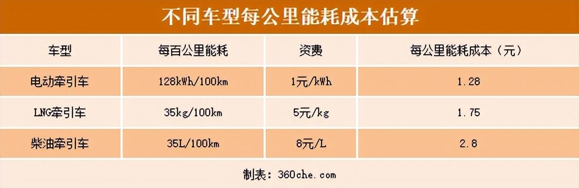 有時閑暇的時候他們也會跟身邊采用不同動力的卡友對比運(yùn)輸成本,涵蓋了柴油、LNG車型等。按照現(xiàn)在油價8元/升計算,柴油卡車的每公里燃料成本大約合到2.8元。燒氣的話也要比電動牽引車成本要高,按照5元/千克計算,每公里大約合到1.75元。