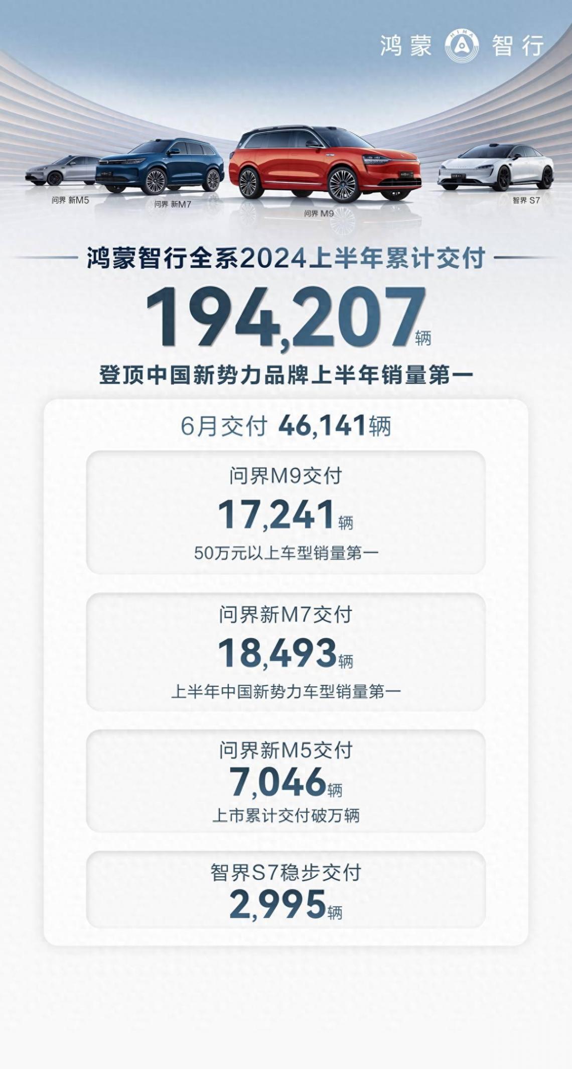 據(jù)官方數(shù)據(jù)顯示,鴻蒙智行6月交付46141輛,2024年累計(jì)交付194207輛,登頂中國(guó)新勢(shì)力品牌上半年銷量第一。其中,豪華科技旗艦SUV問(wèn)界M9,6月交付17241輛,累計(jì)大定超10萬(wàn)輛;國(guó)民SUV問(wèn)界新M7,6月交付18493輛,穩(wěn)居2024年上半年中國(guó)新勢(shì)力車型第一;高顏都市性能SUV問(wèn)界新M5 6月交付新車7046輛,累計(jì)交付超1萬(wàn)輛;鴻蒙智行首款智慧轎車智界S7,6月交付新車2995輛。