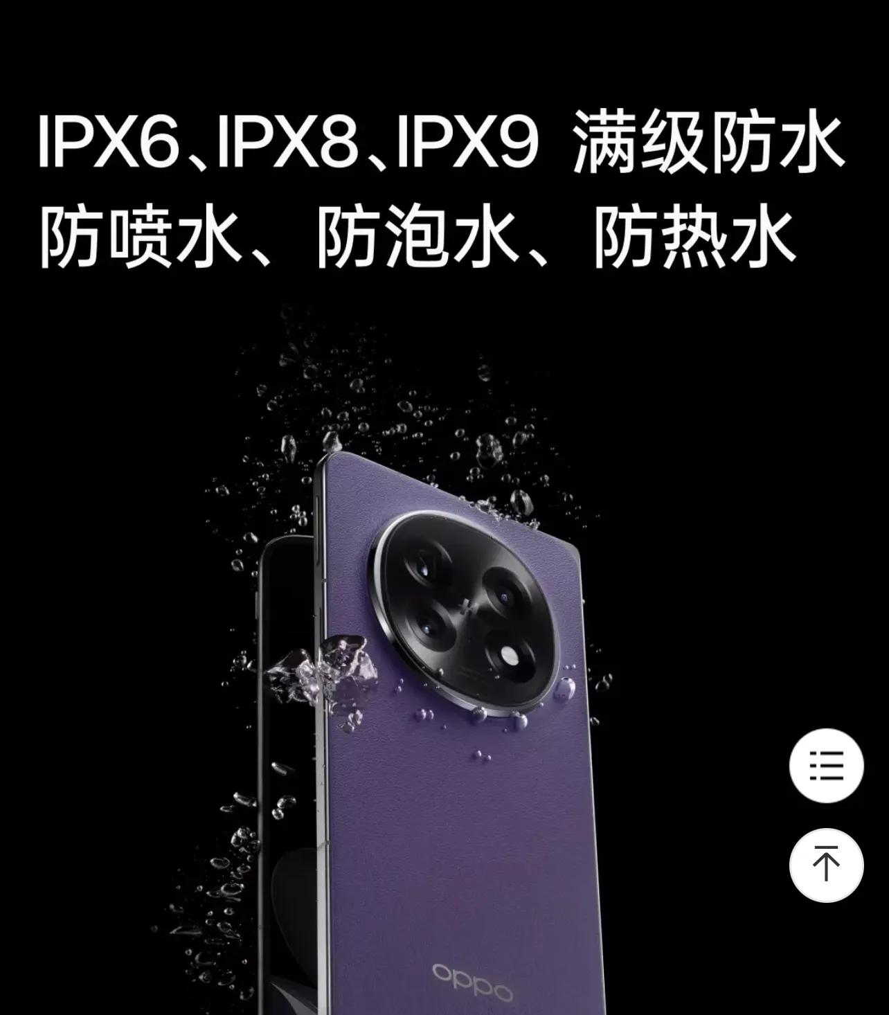 OPPO Find N5是全球首款擁有IPX6(防高壓噴水)、IPX8(可在水下2米浸泡)、IPX9(耐受高溫蒸汽)三重認證的折疊屏手機!經過實測,在淋浴時刷劇、在溫泉池邊回復消息都毫無問題,甚至在水下1.5米的環境中拍攝30分鐘,手機依然能正常使用。據OPPO工程師介紹,鉸鏈內部使用了納米疏油涂層,連水蒸氣都很難滲透進去。