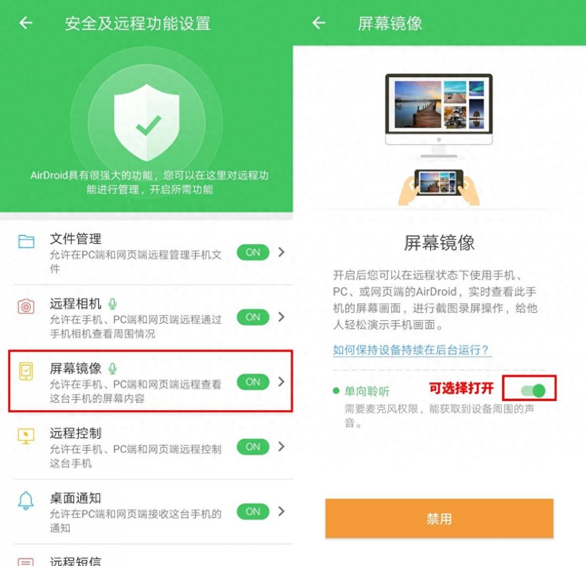 然后,在華為手機安裝AirDroid,注冊并登錄賬號。點擊【個人】【安全及遠程功能設(shè)置】,打開【屏幕鏡像】開關(guān),開啟相關(guān)權(quán)限。無需打開單項聆聽。
