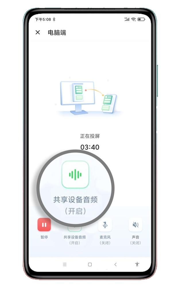 第三步,將電腦上的投屏碼填寫到手機,連接成功后,打開華為手機端AirDroid Cast里面的【共享設(shè)備音頻】按鈕。安卓10.0及以上版本的手機才有這個共享音頻功能。