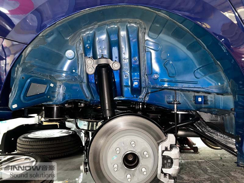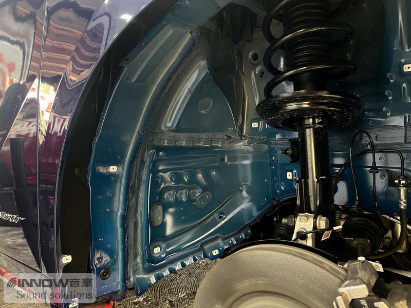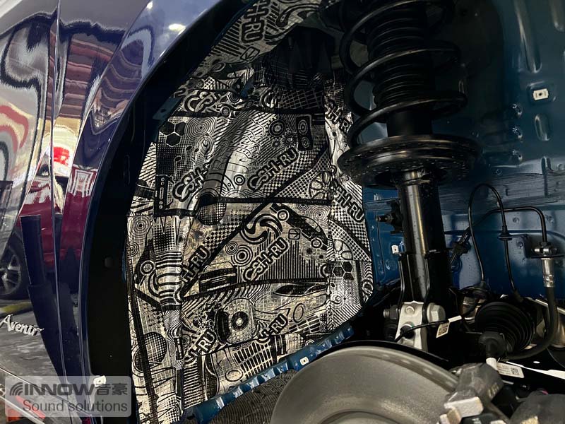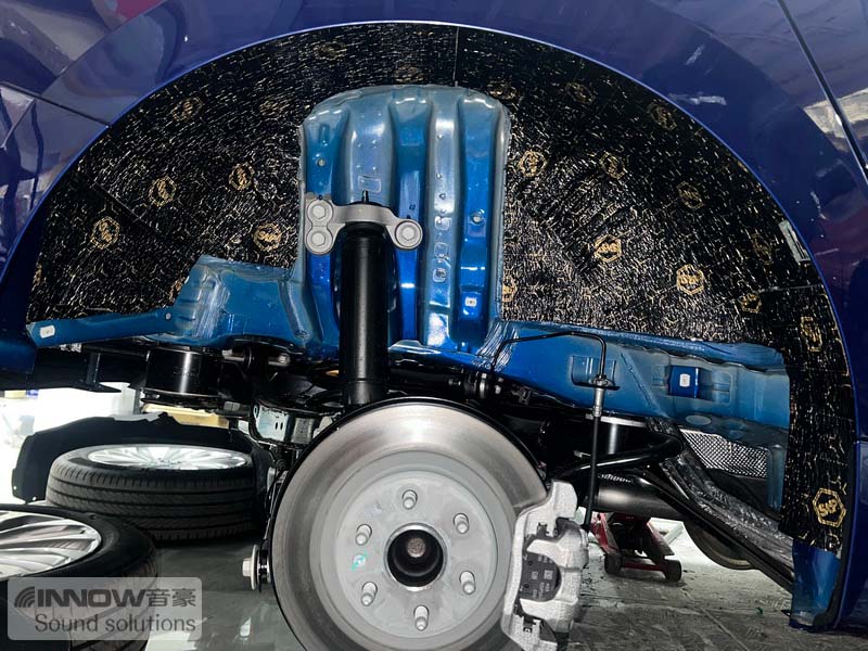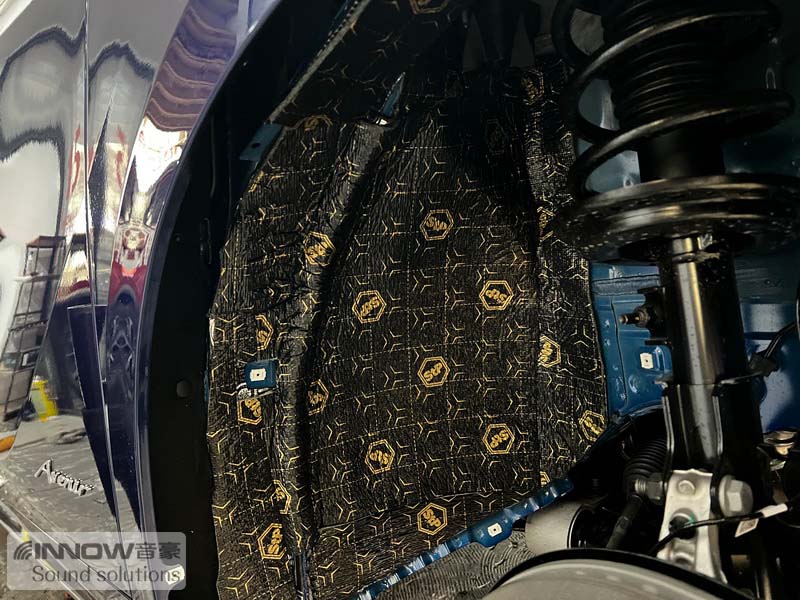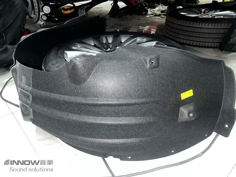 止振完成后,技師使用AC06棉做隔音處理,減少噪聲的傳入;而拆卸下來的翼子板內襯,技師則使用NB2棉,對四輪翼子板做了吸音處理,多層的施工,將路噪和胎噪阻擋在了車廂之外。