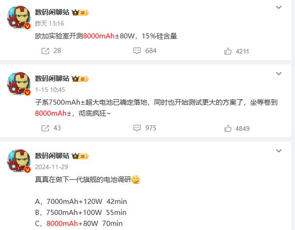 OPPO和一加也不甘示弱,據(jù)業(yè)內(nèi)人士透露,歐加實驗室正在對一款配備8000mAh大容量電池及80W有線充電技術(shù)的續(xù)航系統(tǒng)進行測試。該系統(tǒng)采用了15%的高硅含量材料,預(yù)示著OPPO和一加的新機型在續(xù)航方面有望實現(xiàn)顯著提升。