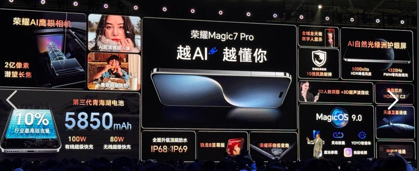 榮耀Magic7 Pro:5600mAh(或5850mAh)電池+100W有線快充(40分鐘充滿),續航能力更強,適合全天候使用。