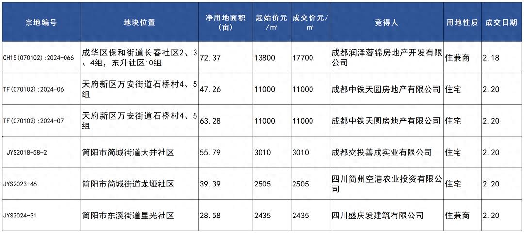 據(jù)成都公共資源交易中心網(wǎng)站,本周(2月13日—2月19日),成都有6宗涉宅用地成交,面積合計(jì)306.67畝。